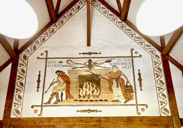 In contrast, Alfred the Great was definitely a real person: King of the West Saxons from 871 to 886, and King of the Anglo-Saxons from 886 until his death in 899. There is an unmissable statue of him on the High Street in Winchester. Alfred spent many years of his reign fighting a Viking invasion. He finally won a decisive victory in the Battle of Edington – about 40 miles west of Winchester – in 878. The mural in W.H. Smith depicts an earlier episode when his struggle against the Vikings was going very badly. He was forced to flee to the Somerset Levels, where, according to legend, he was given shelter by a peasant woman. Unaware of who he was, she left him to watch some cakes she had left cooking on the fire. Worried about the problems of his kingdom and the Vikings, Alfred accidentally let the cakes burn; he was scolded by the woman upon her return, and he apologised. There is no contemporary evidence for the legend, but if it is not true, it perhaps shows that people recognised Alfred as a humble man.