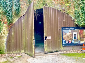 At the end of Old Station Approach, you’ll see the double doors that close off the old railway tunnel. (There is a poster on the doors that says ‘Chesil, behind doors…’ )